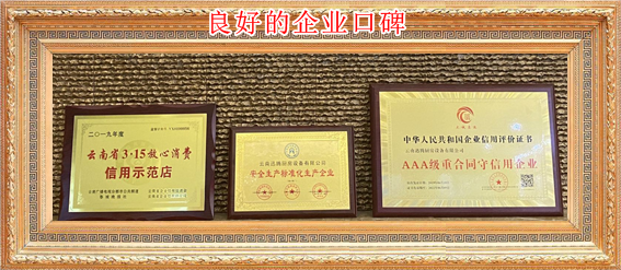 • 我公司自創建以來,堅持以“精工鑄造精品、質量鑄就品牌、誠信鑄未來、實惠鑄市場”的原則”;本著“將客戶放在第一位,讓客戶滿意才是我們最終的追求,一工程一樣板”的經營理念;公司在2018年-2019年度連續被昆明3.15評為《3.15誠信企業》,省質監授予《安全生產標準企業》;